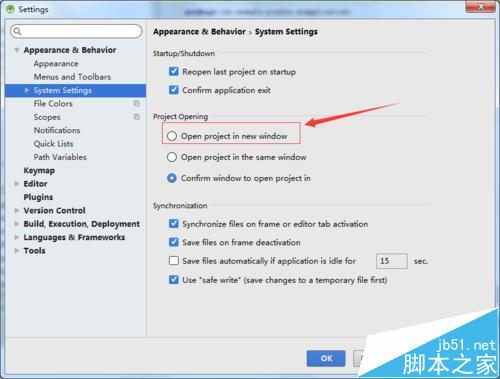 5、进入到了system settings的选项中之后,在project opening中进行下列中有三个的选项的进行任意上选择,进行勾选上open project in new window中,就会打开一个新的项目之后,就会自动打开一个新的窗口。