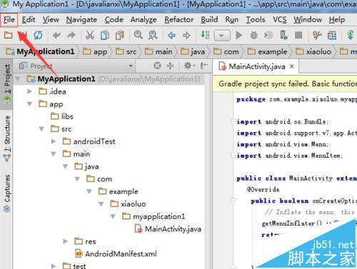 1、对新项目的默认确认信息进行设置,进行打开android studio菜单中的file的选项菜单。