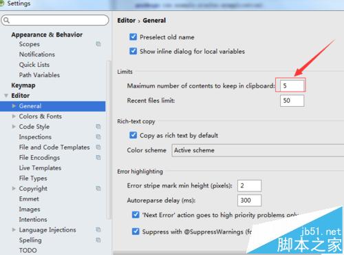 5、进入到了general的选项中之后,在limits中的maximum number of contents to keep in clipboard的更改为较大一点。例如改为8。