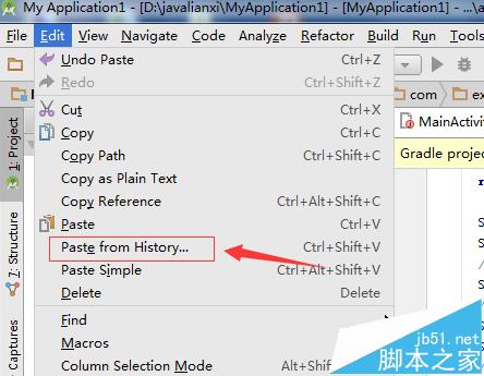1、进行点击Android studio菜单中的edit的后弹出下拉菜单中进行选择为paster from history选项。
