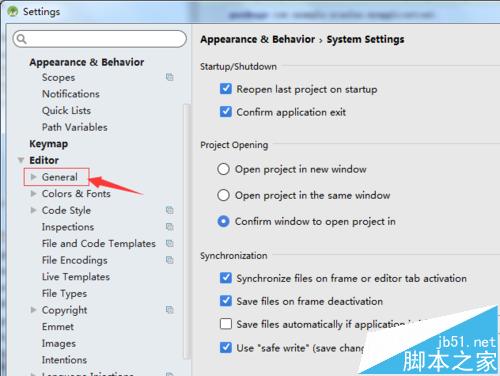 4、进入到了settings的选项中之后进行选择为editor的选项展开之后,进行选择为general的选项。