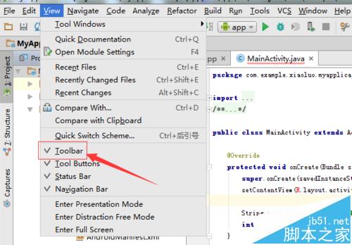 2、进行点击android studio菜单中的view的选项,然后弹出了下拉菜单中进行选择为“Toolbar”的选项。