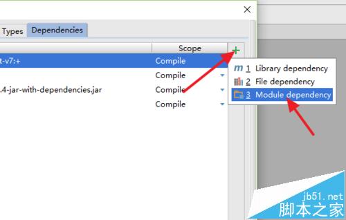 3、点击右侧的“+”添加按钮,在下拉菜单中找到Module Dependency(项目依赖),点击打开项目选择窗口。