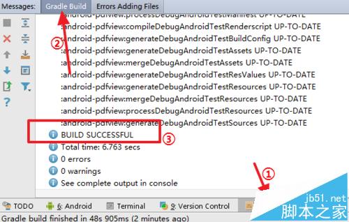 7、项目进入到Gradle自动构建的环节。构建完成后点击底部的Messages,选中Gradle Build。在里面提示了BUILD SUCCESSFUL,说明项目构建完成。这时Library项目就导入到原始项目完毕,可以在项目中正常引用Library项目中的内容了。