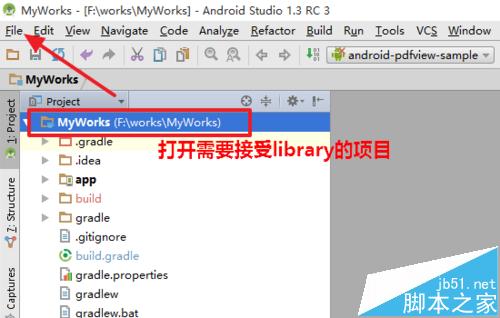 1、启动AndroidStudio后,打开你需要接收Library的项目。比如有两个项目,项目A,和Library项目B,那么打开项目A。图中所示为项目的结构图,点击右上角的File菜单。