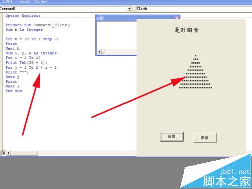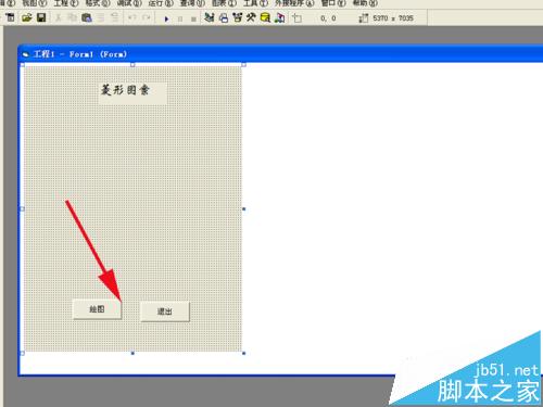 4、在工具箱里连续两次双击按钮工具,在窗体出现两个按钮,调节按钮在窗体上的位置,修改两个按钮的caption属性,一个为绘图,一个为退出。