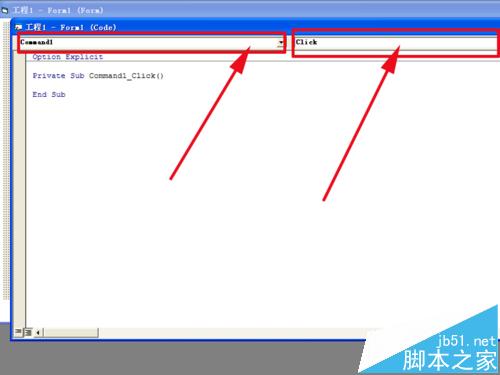 5、双击绘图按钮进入代码区域,在对象中选择commmand1,在过程中选择click,然后就可以在此输入代码了。