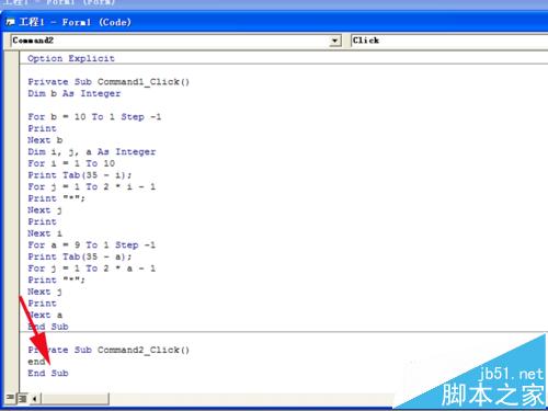 8、双击commmand2按钮进入退出按钮的代码区域,由于该按钮的功能是点击之后退出程序,所以只要输入end语句即可。