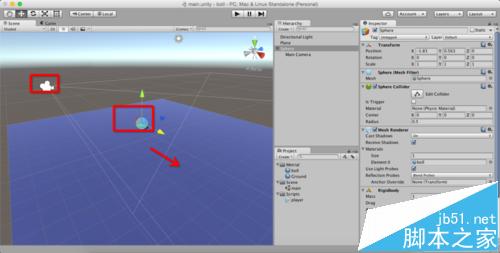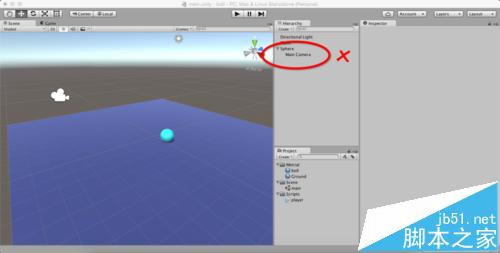 2、我们先来看看上面说的不可行的方法:如图,直接将"Main Camera"拖动到"Sphere"的子目录,即让摄像机成为小球的子物体,这样,两个对象就可以一起运动了,那么我们来看看到底可不可行。
