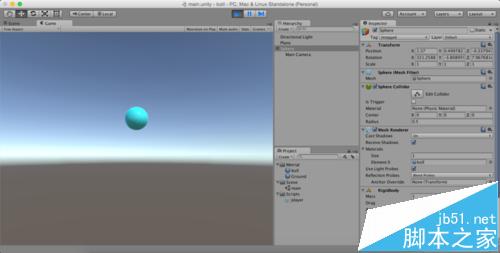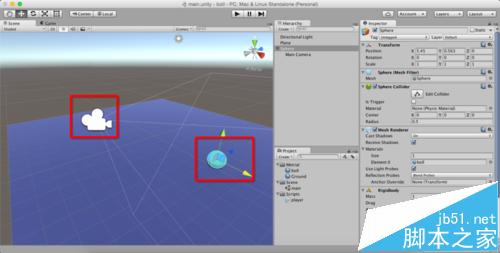 1、如图,我们已经给小球添加了移动的脚本,小球是Sphere,现在想实现的是让摄像机MainCamera跟随小球一起运动。