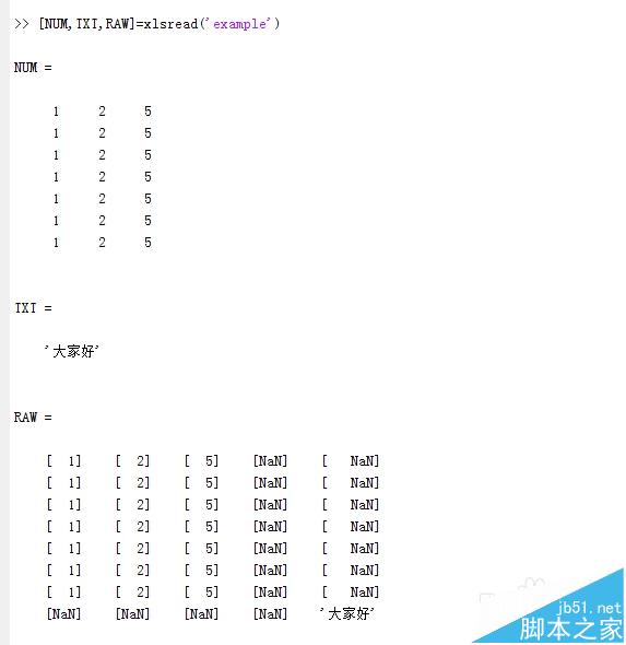NUM返回的是excel中的数据,TXT输出的是文本内容,RAW输出的是未处理数据,这里因为文本占用的矩阵一共是8行6列,所以就输出了如上内容。一般情况下,我们读取的都是excel中的数据,所以可以直接用[NUM]=xlsread('example'),只输出数据矩阵便可。