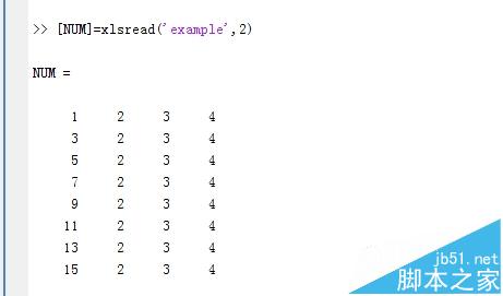 假设我们读取A3-D7之间的数据,那么我们输入命令[NUM]=xlsread('example',2,'A3:D7'),回车,结果如下: