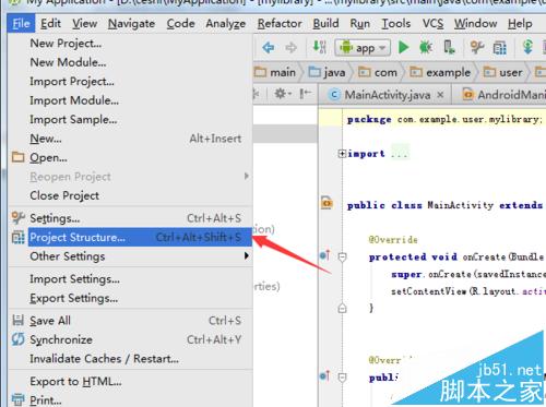 1、进行添加相关的依赖包模块,就需要打开Android studio的程序,进行开发界面中之后,点击菜单“file”》“project structure”。