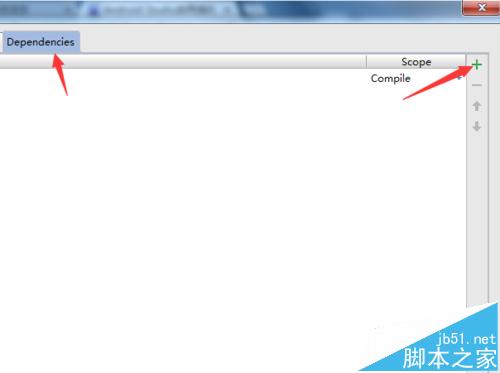 3、进入到该项目中点击中间位置中的“Dependencies”后,进行点击添加按钮“+”。
