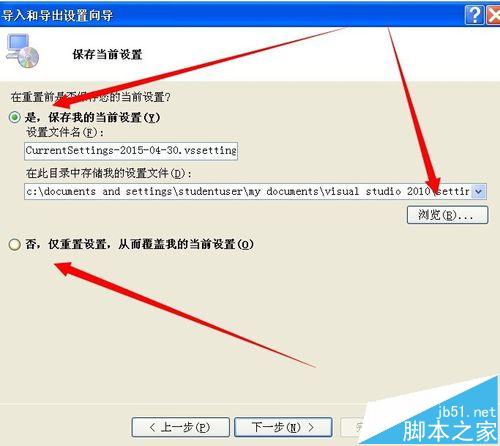 4、如果你想保存你当前的设置的话,你点击是,并且选择你要保存的文件位置。如果你不想保存的话,直接点击否,点下一步即可