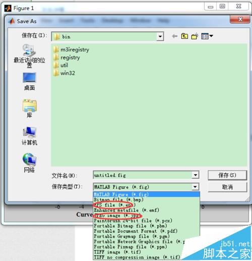 在弹出的保存窗口中选择具体的保存格式,eps或jpg。另外该方法可以写成命令形式saveas(gcf,'1.eps')或saveas(gcf,'1.jpg'),方便在脚本文件中执行。