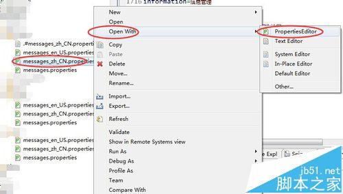 9、此时在properties文件上点右键,点击“Open With"-"PropertiesEditor",打开文件,现在就可以直接输入中文了。