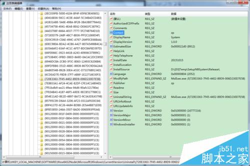 注:如果是32位,应该是HKEY_LOCAL_MACHINE\SOFTWARE\ Microsoft\Windows\CurrentVersion\Uninstall\{产品码},如下图所示: