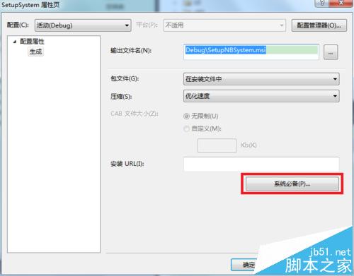 1、选中安装项目工程,打开右键菜单,点击属性,弹出属性对话框。点击系统必备,弹出系统必备对话框。输出文件名项中可以设置输出文件的路径,安装程序最后会输出到这个路径下,如下图所示: