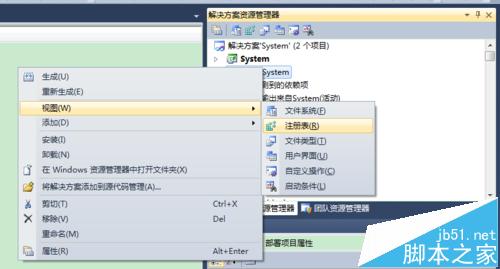 1、在“解决方案资源管理器”窗口中选中安装项目,单击鼠标右键,在弹出的对话框中选择“视图/注册表”选项,如下图所示: