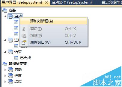 2、添加对话框。在用户界面视图中,选中 启动,打开右键菜单,点击 添加对话框,如下图所示: