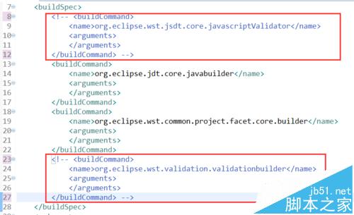 2、打开 .project文件后,注释掉 org.eclipse.wst.jsdt.core.javascriptValidator 和org.eclipse.wst.validation.validationbuilder,这样就去掉了javascript 和 builder的验证了。