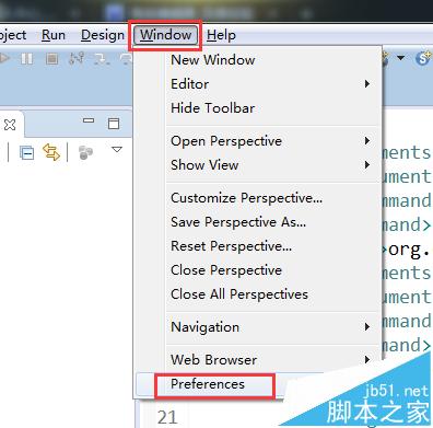 3、继续跟着操作,在菜单栏里的window右键选择Preferences。