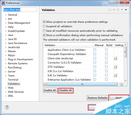 在eclipse里面,特别是web项目,每次运行项目的时候eclipse都会去验证js,xml,jsp等等的验证,在开发中很是浪费时间。今天我就告诉大家如何让你的web项目加速,去掉这些烦人的验证。