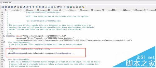 4、同时,打开settings.xml的文件,修改 如图的内容,为 刚创建的 settings.xml的存放地址, jar库 都是放在 repository 文件夹下的。