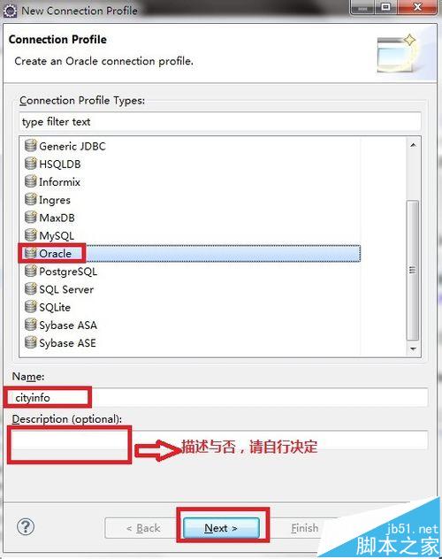5、出现新窗口,找到自己正在使用的数据库"Oracle",自行起个名字,小编在此起了"cityinfo"这个名字。然后单击“Next>”。如下图所示: