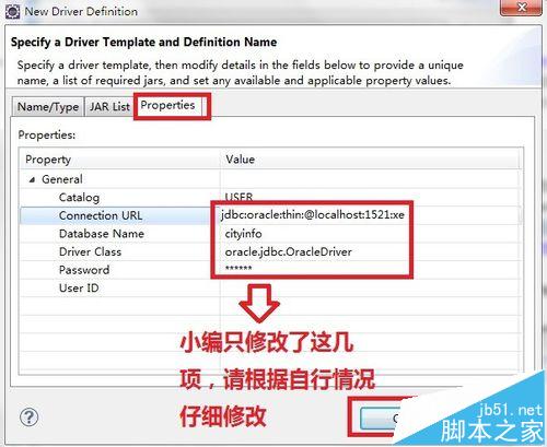 10、进入properties标签栏,输入自己所建数据库相关内容,小编在oracle中建的用户名是“cityinfo”。这一步各自的信息可能不同,请自行决定。然后单击“OK”。