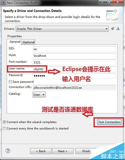 11、上步点击“OK”后,会返回前一个窗口,这时,Eclipse会提示要求输入"user name"用户名,就是大家所建立的数据库的名称,不是任意起的名字。输入后,可单击下方的"Test Connection",当提示“Ping Successed!”时,表示Eclipse和oracle连接成功。然后单击“Finish”完成配置。