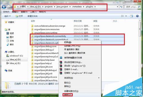 若想彻底删除自己上面在Eclipse中所配置的数据库相关信息,可在你的java项目文件夹中找到 D:\projects\java_project\.metadata\.plugins这一位置,然后选中“org.eclipse.datatools.connectivity”、“org.eclipse.datatools.connectivity.ui”、“org.eclipse.datatools.sqltools.result”这三个文件夹,并将他们删除,然后重启Eclipse,此时,原来数据库配置的相关信息就不存在了,就可以重新进行配置。