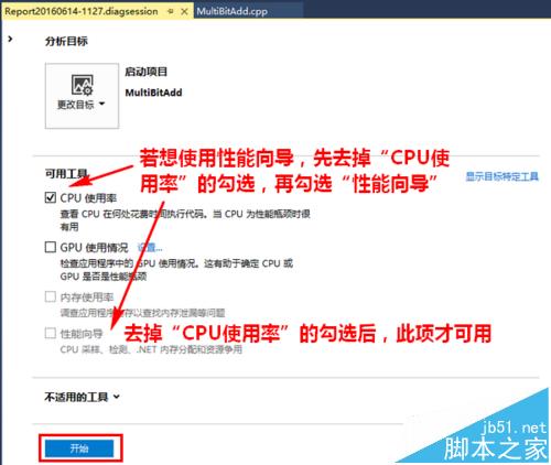 2、这时,将会打开向导窗口。请注意,在向导窗口中,默认“性能向导”一项是灰色的,无法勾选。若是想勾选此项,请先取消“CPU使用率”一项的勾选。取消以后,“性能向导”项就可以选择了。不过,我们在此一般使用默认的选项即可。