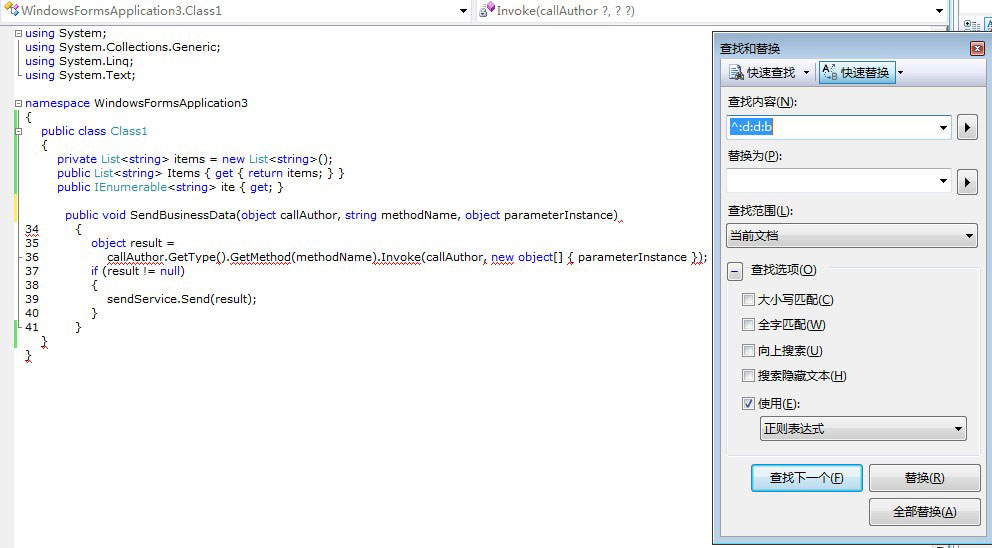 然后在vs2008中ctrl+H调出快速替换功能(下图),查找范围为当前文档或者选中内容,选择使用正则表达式,查找内容填入 ^:d:d:b ,替换内容为空就行啦,一键搞定。一般情况下行号是有1位到三位的数字,使用正则 ^:b@:Nu+:b 就能匹配了,这个的格式就是 行开头+空格+多个数字+空格