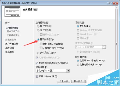 2、建立基于对话框的标准程序,如下图所示,其余设置采用系统设置,点击完成