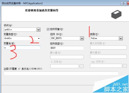6、如下图变量添加向导,1选择Value,2选择Double (方便计算小数)3,是变量名,我们选择a,相同的方式,对上图中的1,5,7分别添加变量,分别为工a,b,sum