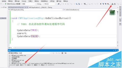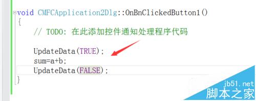8、在这个函数中添加下面代码,UpdataDate()函数中参数true表示从控件变量中获取数值,false相反sum=a+b,就是我们先在控件中添加的三个变量,此处所做的计算器只是用来做个加法
