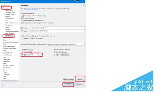 3、单击“General”→“Workspace”,在“Text file encoding”中选择“Other”→“UTF-8”,最后单击“Apply”→“OK”即可。