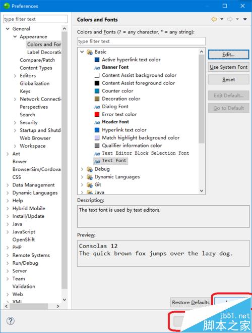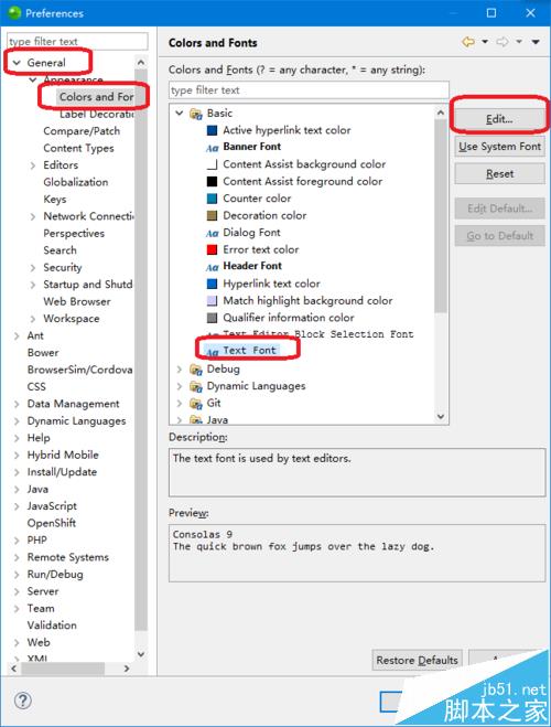 3、单击“General”→“Appearance”→“Color and Fonts”→“Basic”→“Text Fonts”→“Edit”。