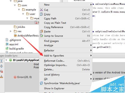 2、右键选中的activity的文件,弹出的下拉的菜单中进行选中“add to favorites”的选项。