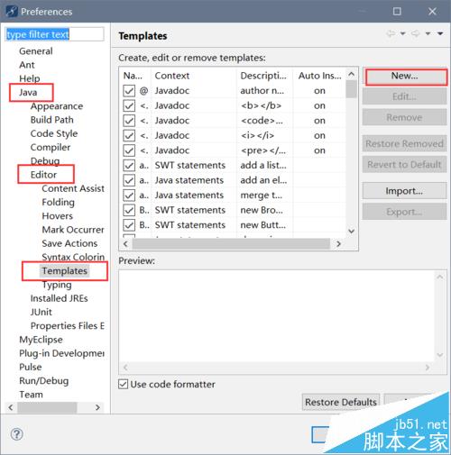 2、进入模板代码添加的界面,并点击new按钮