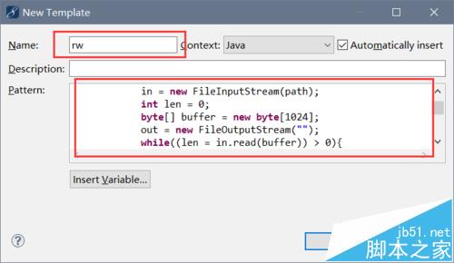 4、比如是添加rw的读写操作代码块,那么name的地方设置名字,pattern的地方添加模板代码