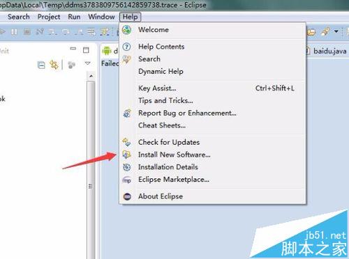 1、进行常用的eclipse的开发的工具,进行到了eclipse的界面中之后,进行点击菜单中的"Help",弹出下拉菜单中进行选择为install new software的选项。