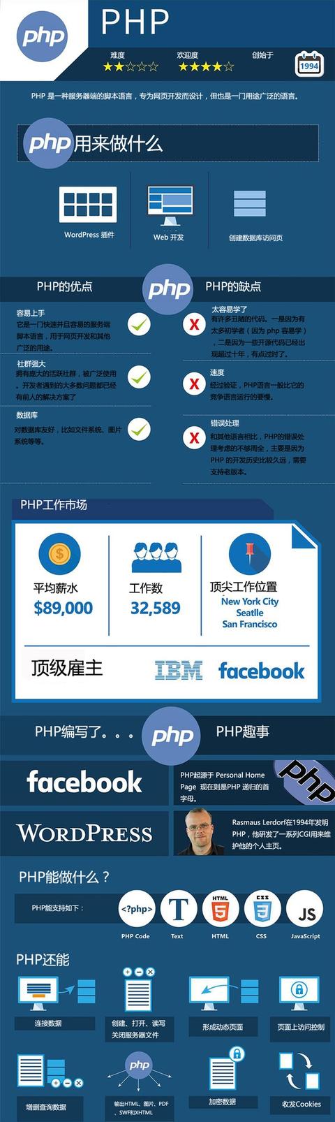 PHP是一门简便的Web开发语言,可广泛用在网站开发,API接口开发,服务器端开发,广告系统开发,内部OA系统开发,移动端后台开发,游戏开发等。入门不难,难的是掌握好一整套开发体系。
