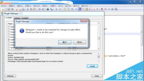 4、配置结束后会提示重启Notepad++,当然要点击restart