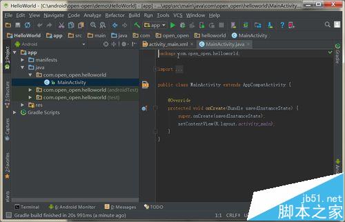 7、点击Finish按钮后,Android Studio开始创建并编译应用。编译结束后,我们就可以看到Android Studio的IDE界面了,如下图所示: