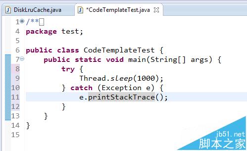 5、在Eclispe中新建一个Java源文件,然后输入tsleep,编辑器会自动替换成: