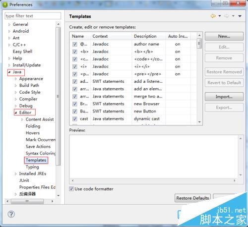 2、在Preferences”对话框中点击“Java”->“Editor”->“Templates”。