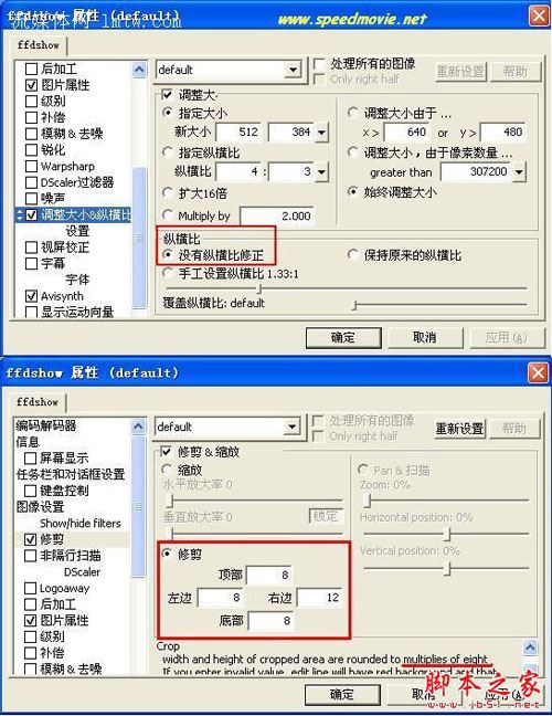 关于画面缩放请参见我中高级教程里的相关部分,ffdshow的这个虑镜解决了如果用压缩软件来缩小画面会极度增加压缩时间的不利因素
